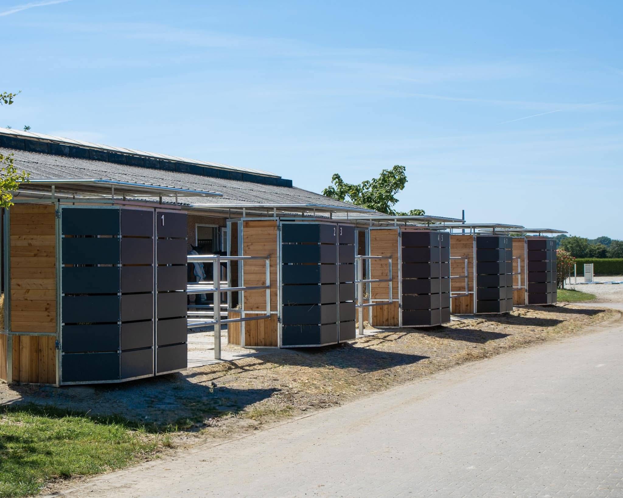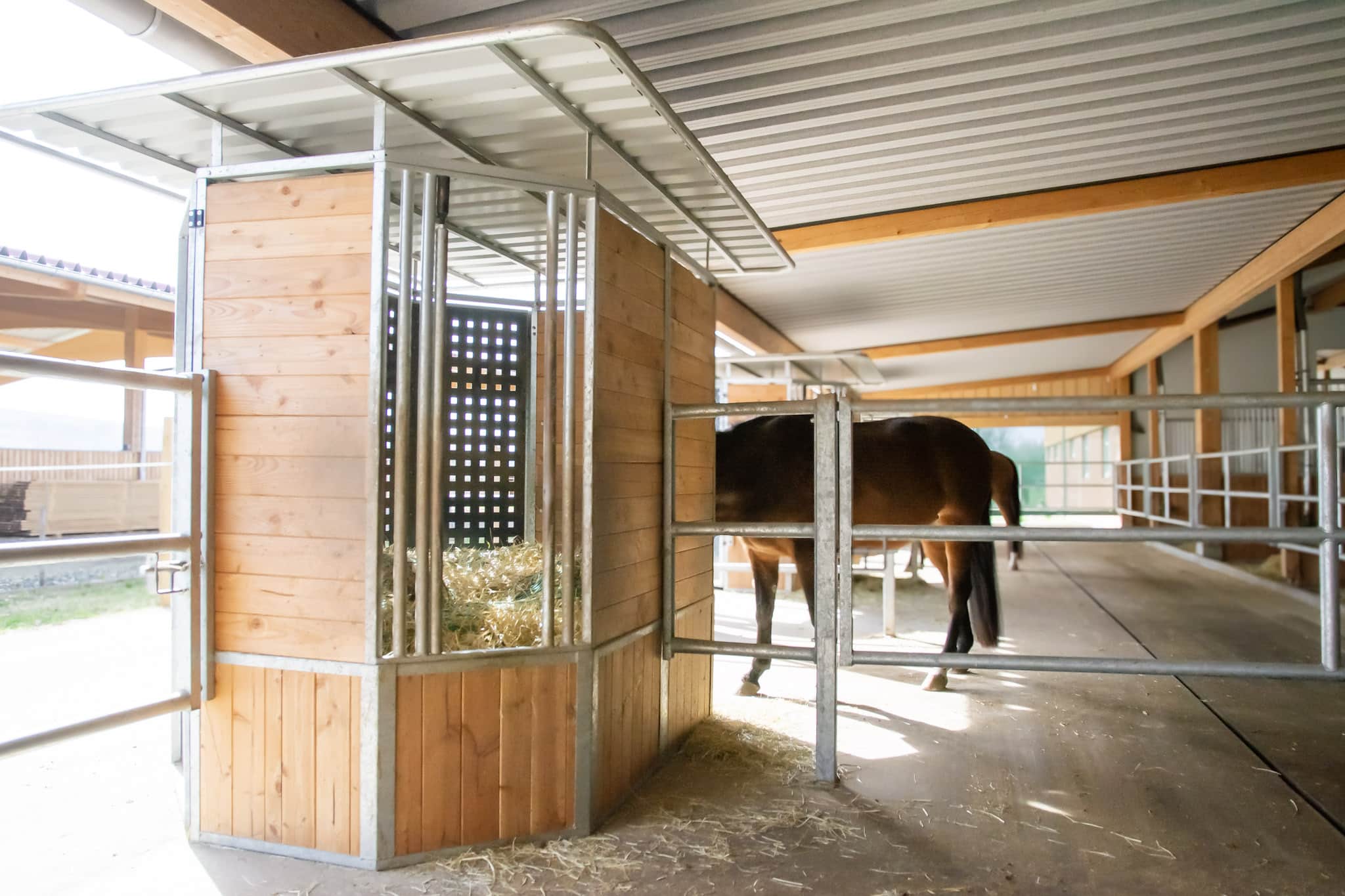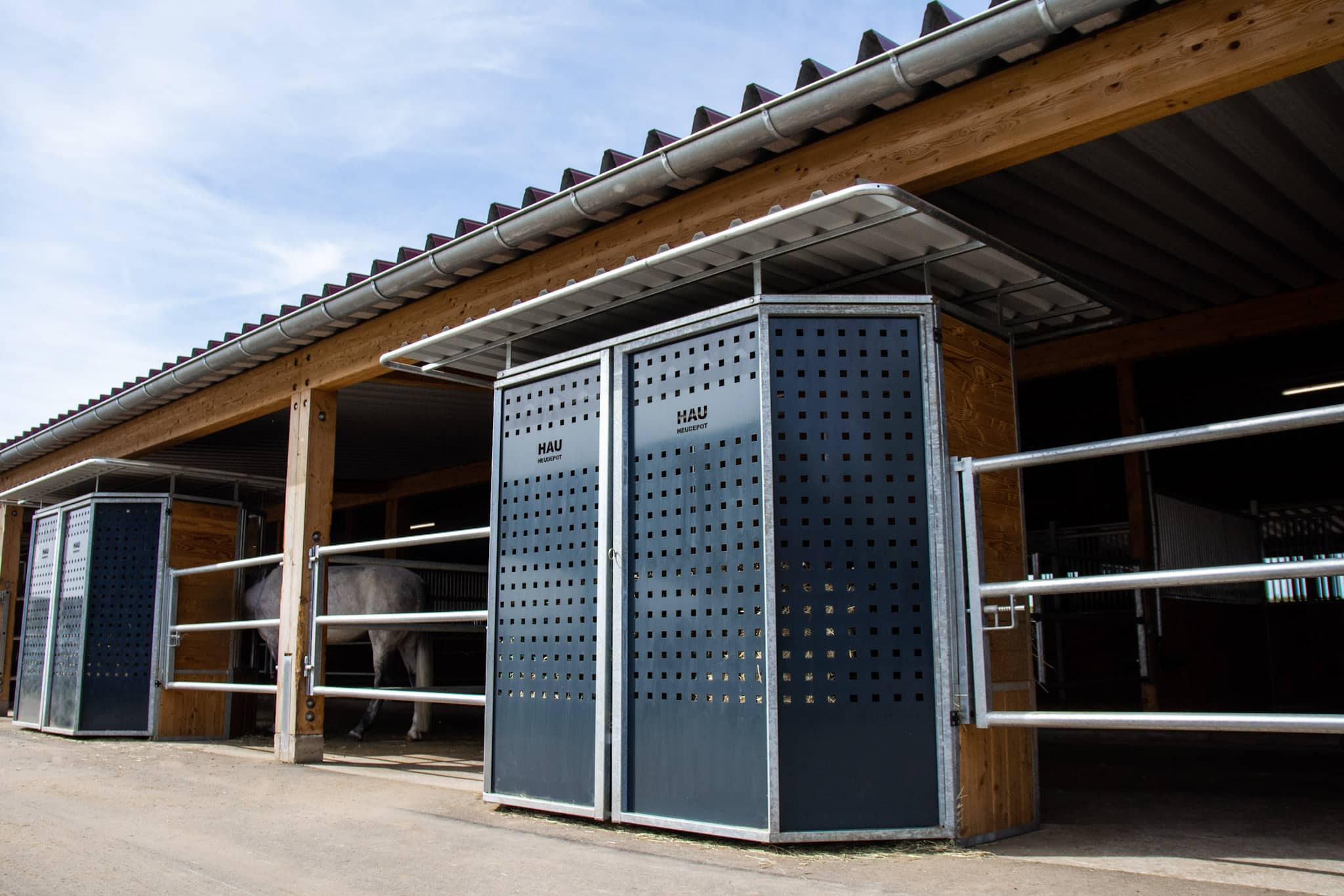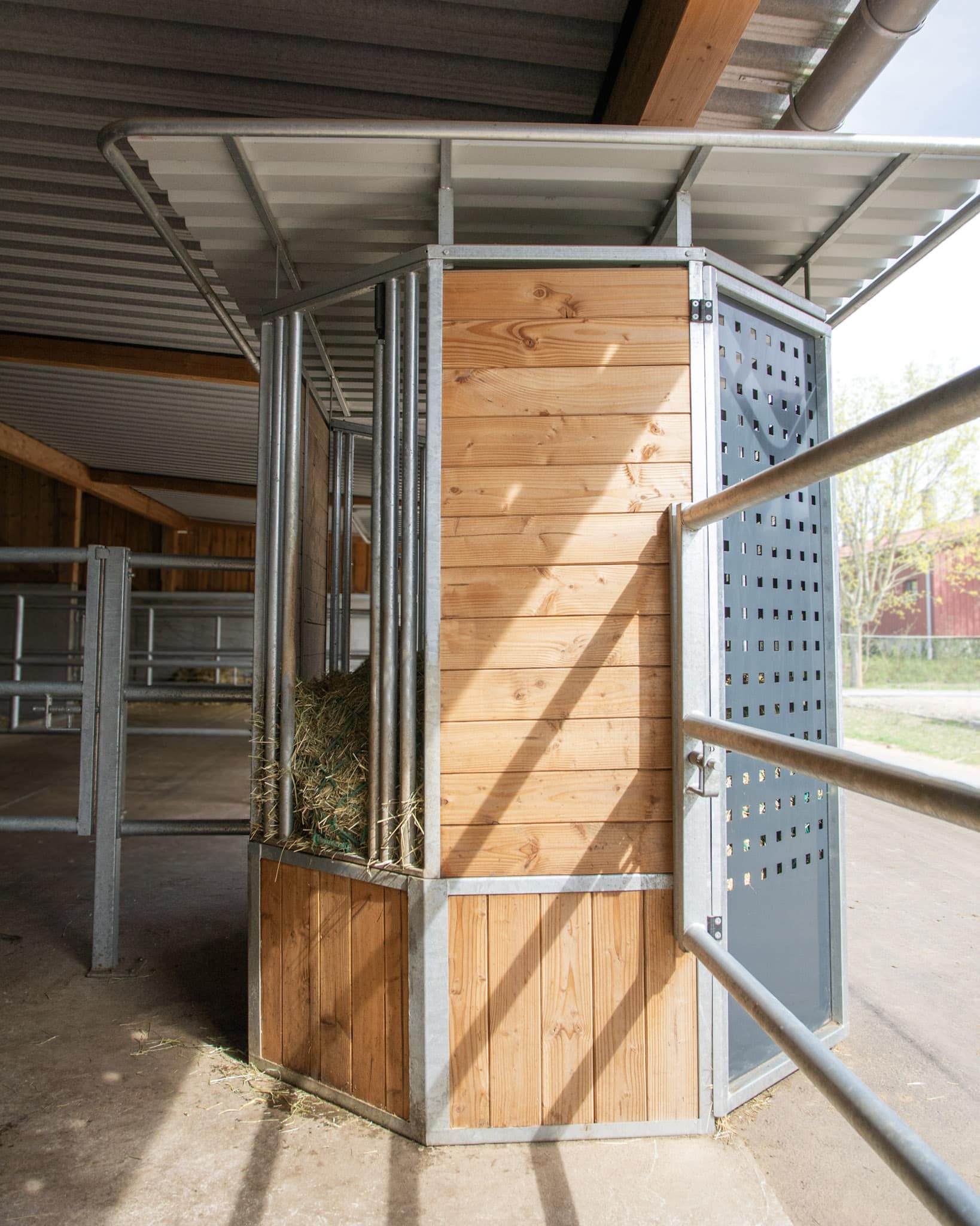 Das HAU Heudepot ist eine Raufe zur Vorratsfütterung, die in die Paddockumzäung integriert oder im Auslauf platziert werden kann. Es kann mit Rund- oder Quaderballen bestückt werden und bietet 2 – 5 Fressplätze.